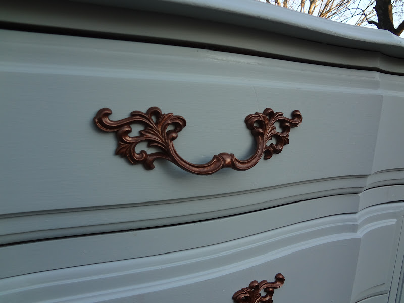 I found this gem at a tag sale a few weeks ago. I loved it from the moment I saw it. Look at all the detail and scrolling! I kept the original (spectacular) drawer pulls, but repainted them a deep copper color. I painted the sideboard a crisp white with just the slightest blue gray undertone. I sealed the entire thing to make the paint very durable. I think the result is downright regal. This one's available and will be put up on craigslist this evening, so shoot me an email if you're interested!
