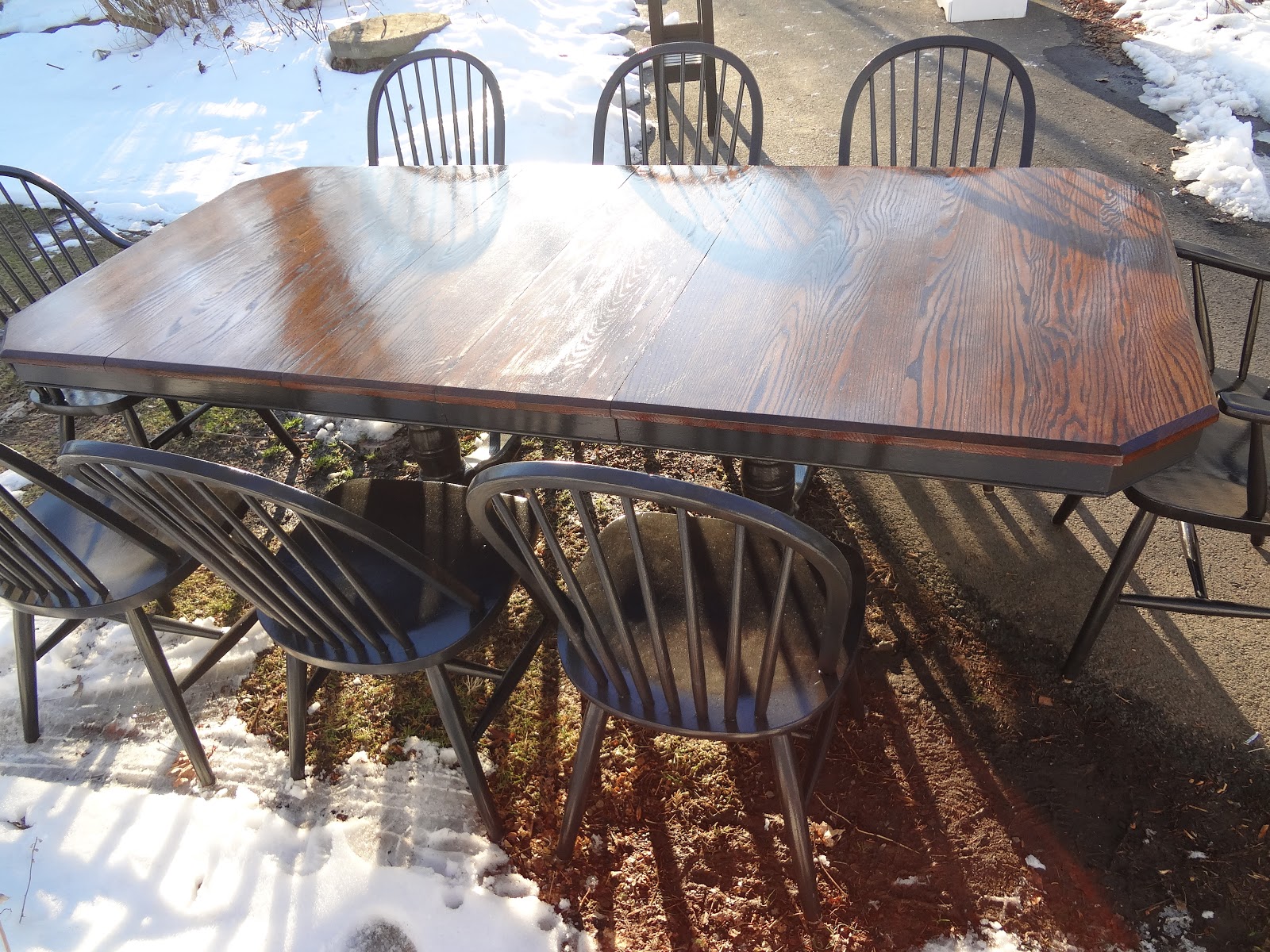 In December I met a wonderful husband and wife who had finally had enough of these terrible New England winters, and were moving to Florida. They were getting rid of most of their furniture and starting fresh down South. I purchased quite a few pieces of wonderful solid oak furniture from them including a sideboard, a dry sink, an eight chair two leaf dining set, a coffee table, and a side table. I've already refinished the sideboard, and now here is the dining set, with a whole new look, and ready for a new home. This set was just grand to work on because everything was already in fabulous condition, so I could concentrate on finishes. I sanded the entire dining table top and two leaves, which took about 6 hours total, then stained the top with a mix of dark walnut (to get a rich deep tone), and gunstock(to add a little hit of color and interest). Then I sealed the top with six coats of poly, sanding between each to get a nice smooth surface. The chairs are painted in a black semigloss. I wish the pictures had turned out better, the reflection of the sun off the snow was making my camera do funny things.