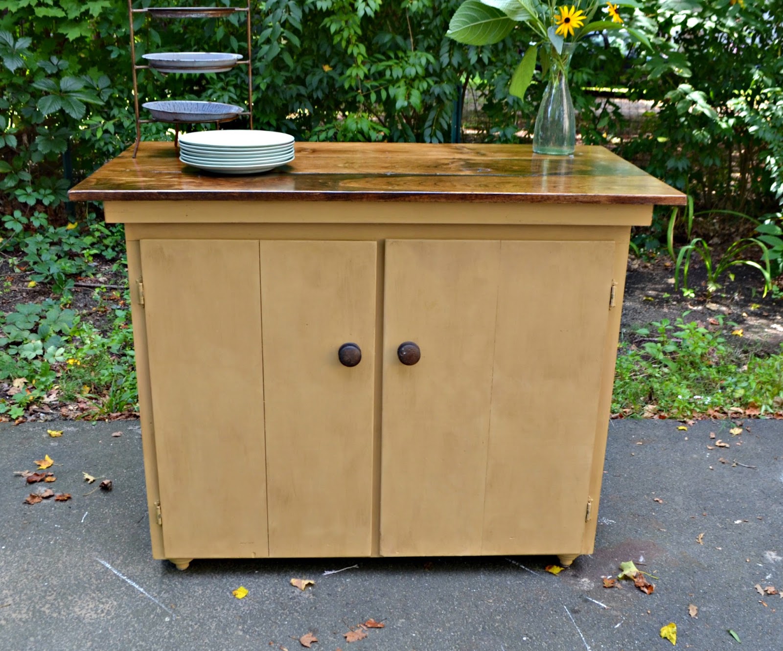 Ah, you know how I love to turn work benches into kitchen islands. Each one is so unique if nothing else but because each was hand made by a craftsman to suit his or her own needs. I purchased this vintage pine work bench at a local church tag sale. Clearly the maker needed lots and lots of storage, because this thing is big, and could easily store everything (...slight hyperbole). Can you tell that I worked on this island at the same time as the china cabinet I just showed you? The colors are allllmost mirror images, though actually they are four unique custom mixed shades.
