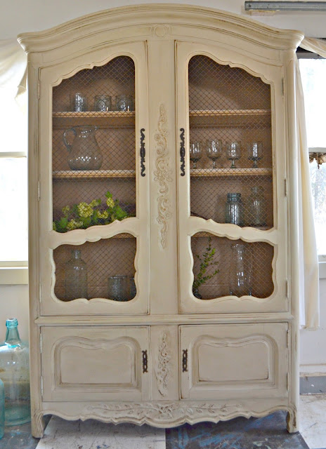 I've had this stunning vintage fruitwood armoire by Thomasville for about a month now. I'll admit, the size intimidated me. In the end, as is usually the case, the furniture I worry about the most is by far the most satisfying to refinish. Now before you yell at me for painting this, what you can't see in the before picture is that the case had been dinged and gouged in several places, there was a hole in the backboard, the shelves were missing, and it had that atrocious 1980s faux pecan splatter finish that I can't believe anyone ever thought attractive. Oh but look at the shape, the carving, that spectacular gently arching top molding, and of course, the wire doors!